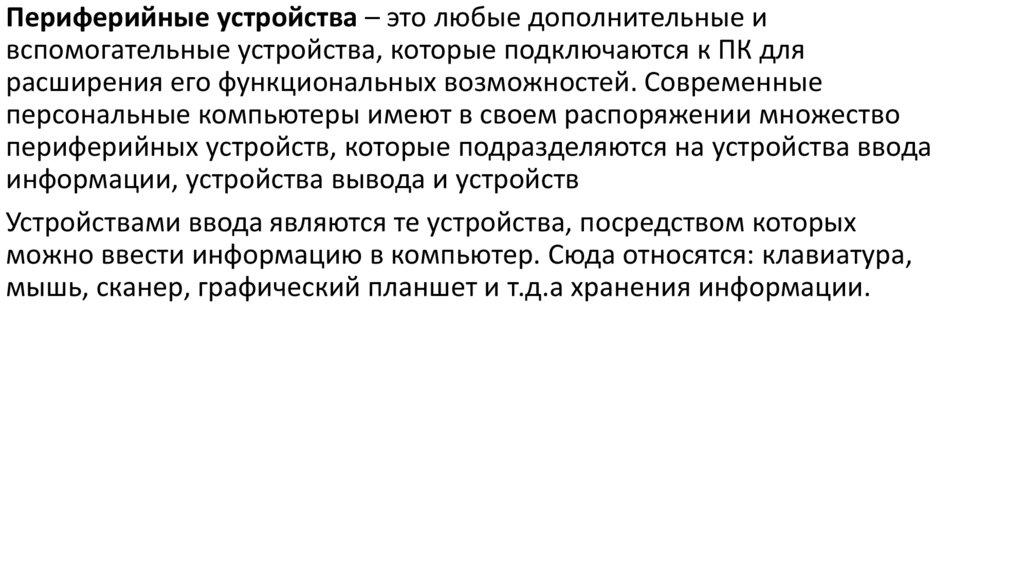 Периферийные устройства – это любые дополнительные ивспомогательные устройства, которые подключаются к ПК для