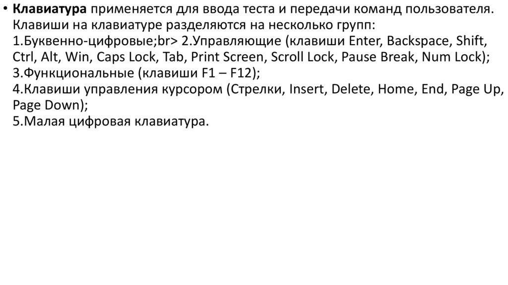 • 3) клавиатура – основное назначение которой ввод алфавитно-цифровой информации;