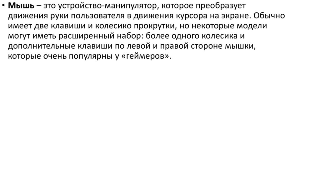 • Мышь – это устройство-манипулятор, которое преобразуетдвижения руки пользователя в движения курсора на экране. Обычно