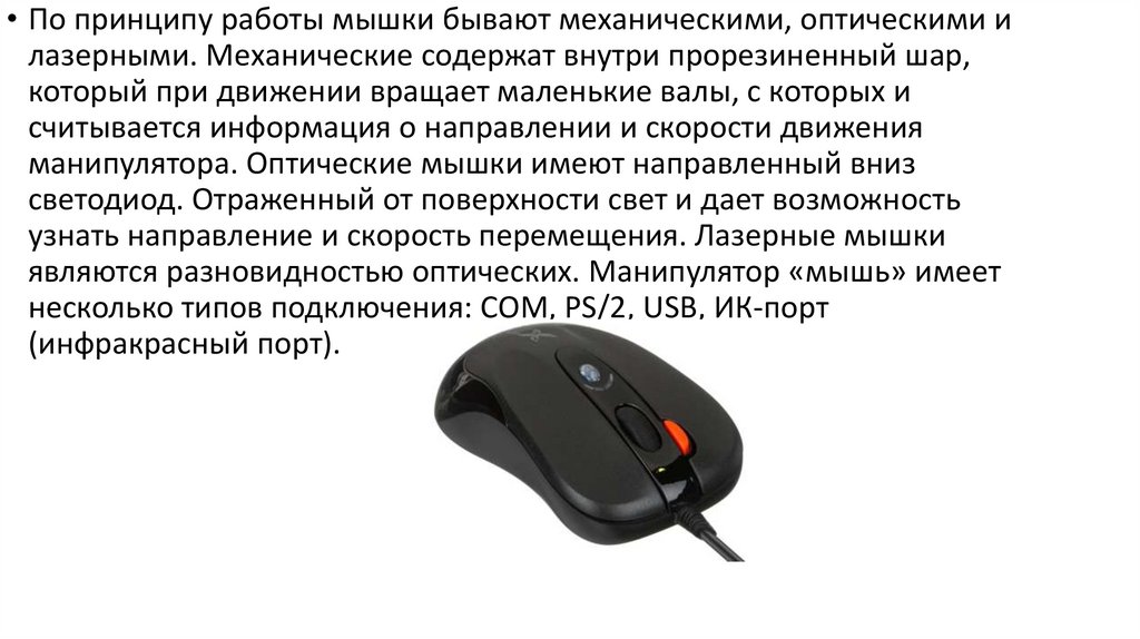 • По принципу работы мышки бывают механическими, оптическими илазерными. Механические содержат внутри прорезиненный шар,