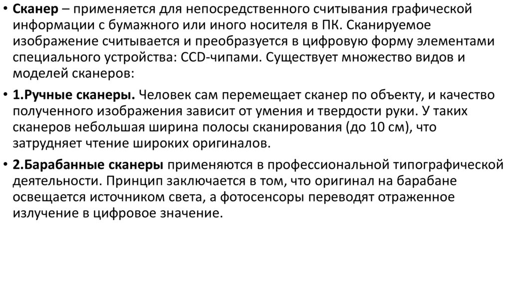 • Сканер – применяется для непосредственного считывания графическойинформации с бумажного или иного носителя в ПК. Сканируемое