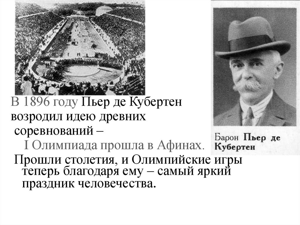 В 1896 году Пьер де Кубертенвозродил идею древних