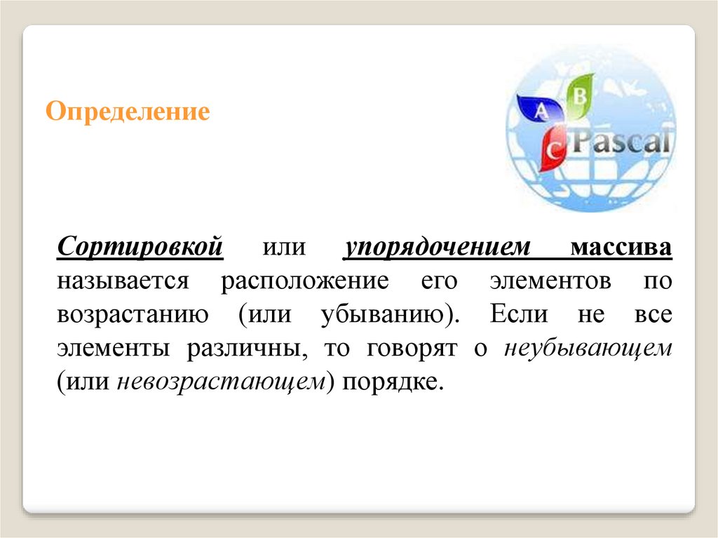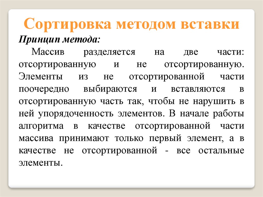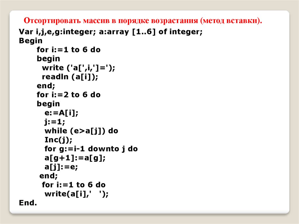 Отсортировать массив в порядке возрастания (метод вставки).Var i,j,e,g:integer; a:array [1..6] of integer;
