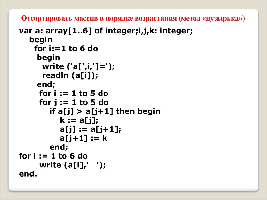 Отсортировать массив в порядке возрастания (метод «пузырька»)var a: array[1..6] of integer;i,j,k: integer;