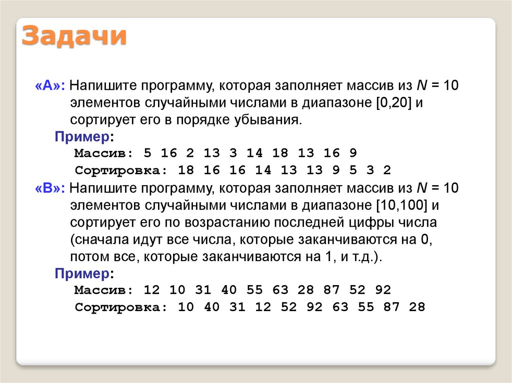 Задачи«A»: Напишите программу, которая заполняет массив из N = 10