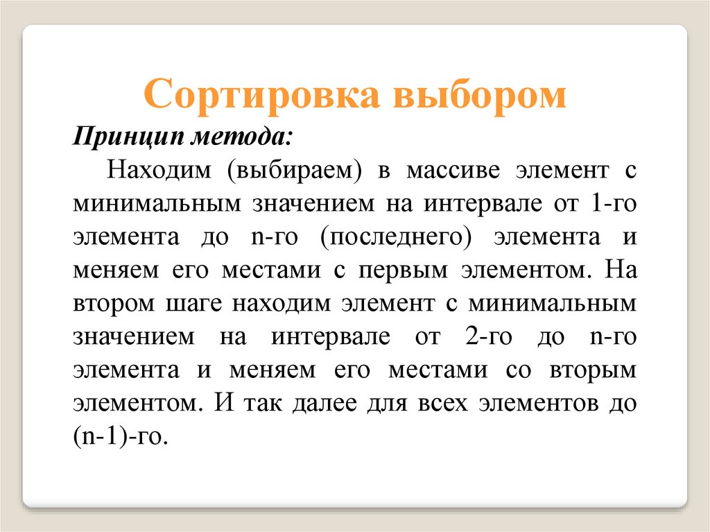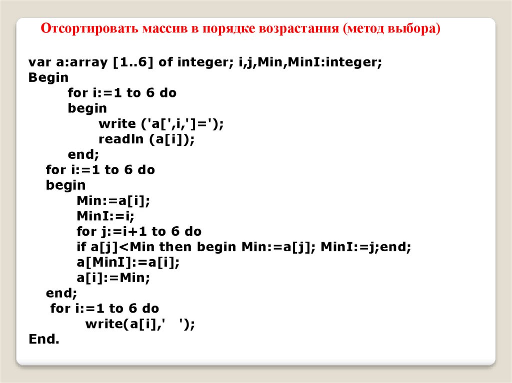 Отсортировать массив в порядке возрастания (метод выбора)var a:array [1..6] of integer; i,j,Min,MinI:integer;