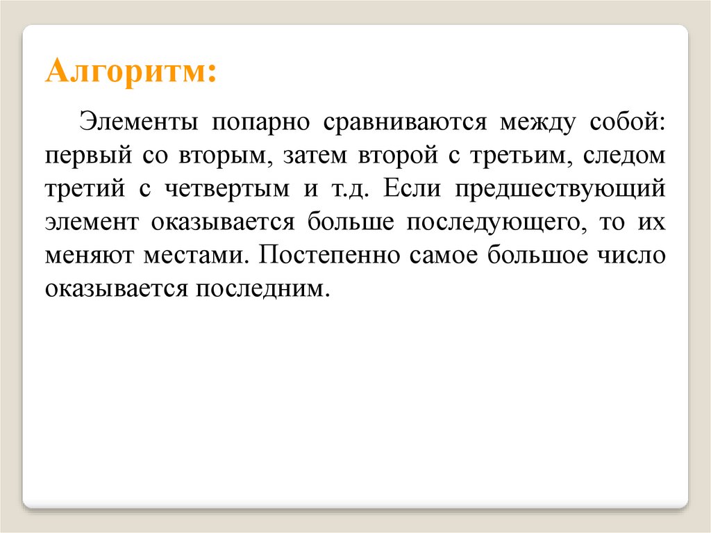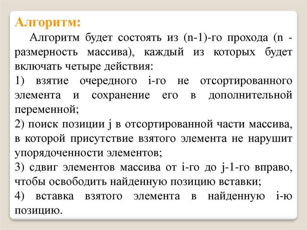 Алгоритм:Алгоритм будет состоять из (n-1)-го прохода (n размерность массива), каждый из которых будет
