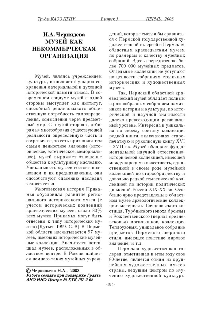îòíåñåíû ê òèïó èñòîðè÷åñêèõ ìóçååâ) [Êóòüåâ 1999. Ñ. 8].  Ïåðìñêîé îáëàñòè íàñ÷èòûâàåòñÿ 97 ìóçååâ, èìåþùèõ èñòîðè÷åñêèå ìóçåéíûå êîëëåêöèè. Çíà÷èòåëåí ïîòåíöèàë ìóçååâ, ðàñïîëîæåííûõ â îáëàñòíîì öåíòðå.  Ðîññèè íàéäåòñÿ íåìíîãî òàêèõ ìóçåéíûõ ó÷ðåæ© ×åðíÿäüåâà Í.À., 2003