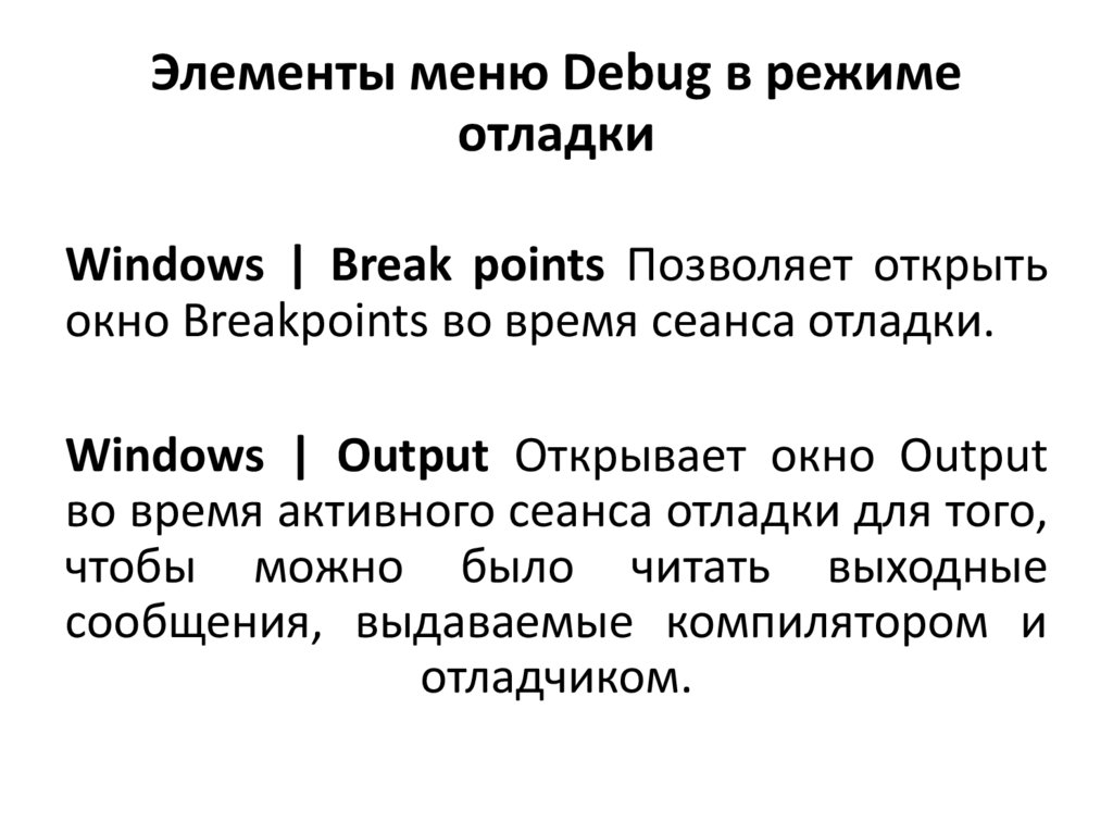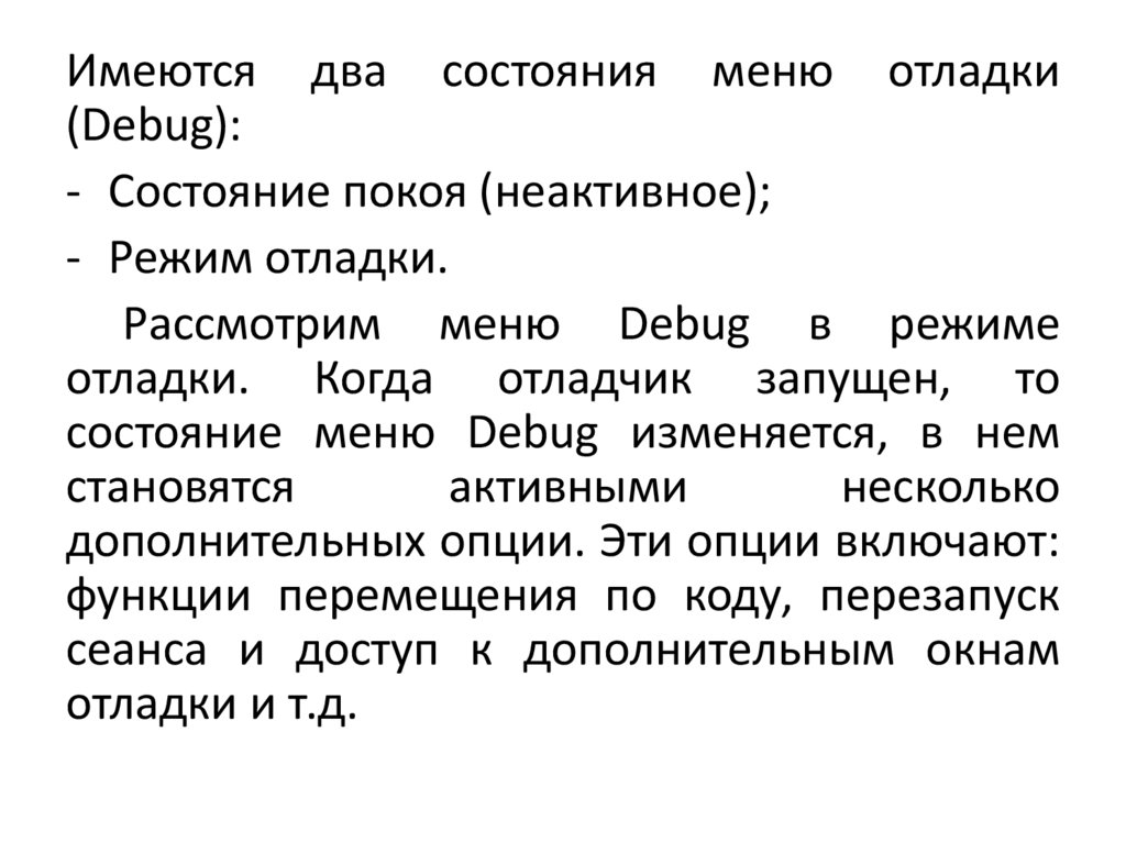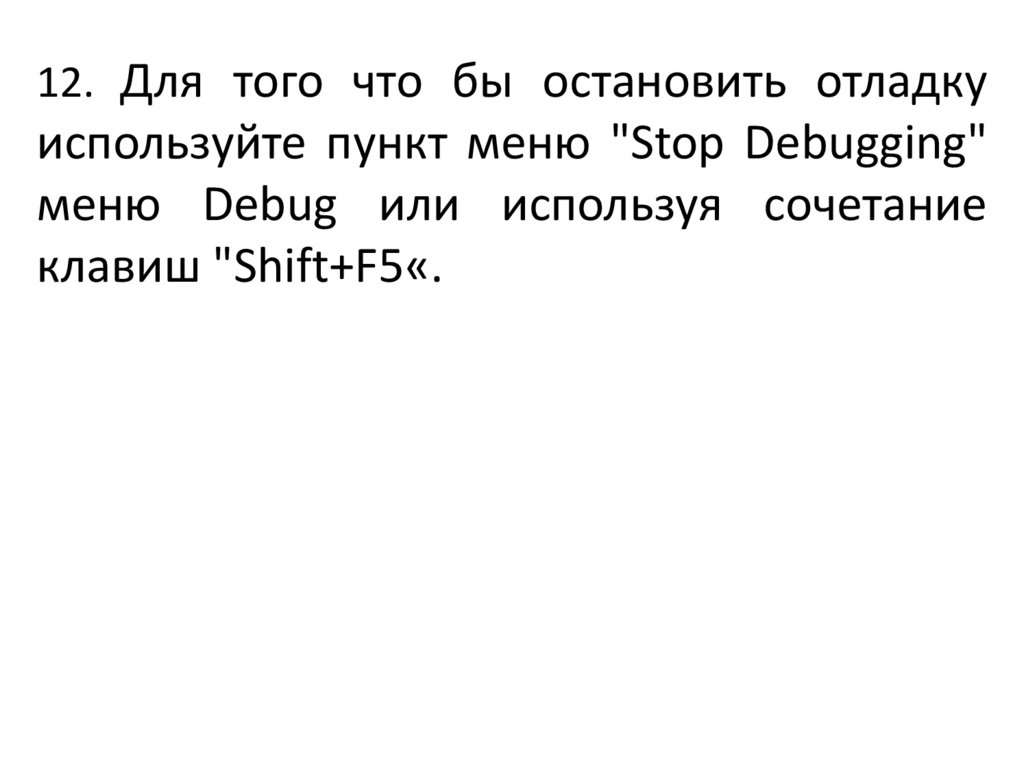 12. Для того что бы остановить отладкуиспользуйте пункт меню "Stop Debugging"
