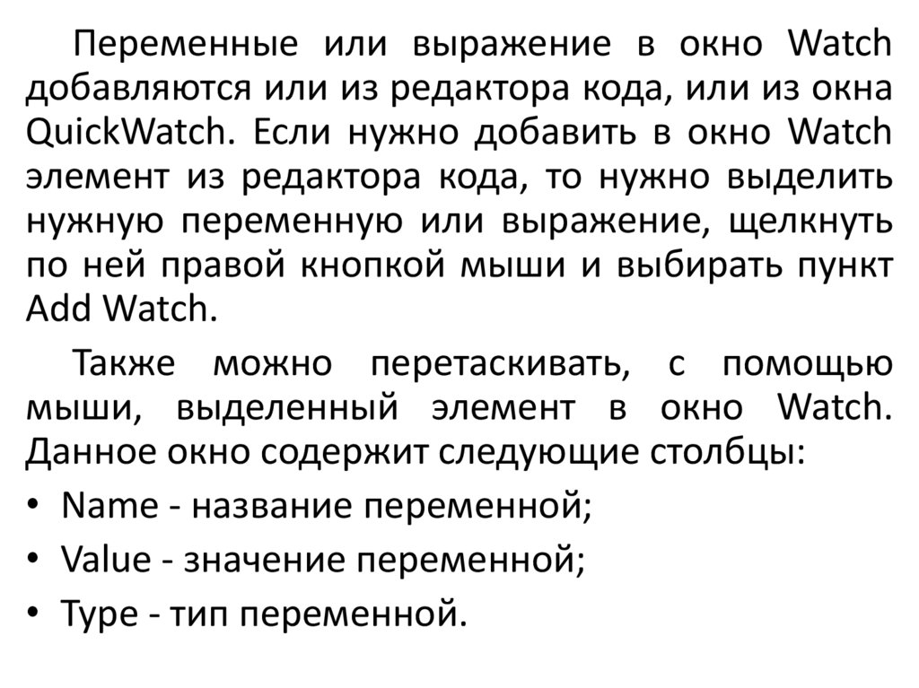 Переменные или выражение в окно Watchдобавляются или из редактора кода, или из окна