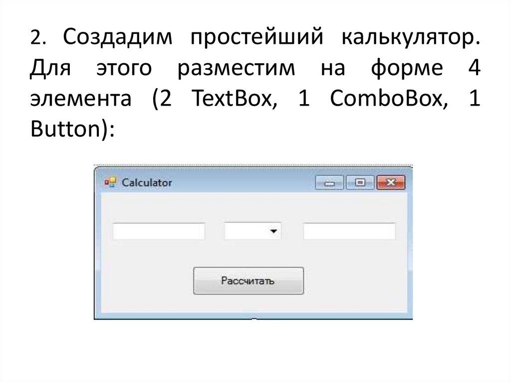 2. Создадим простейший калькулятор.Для этого разместим на форме 4