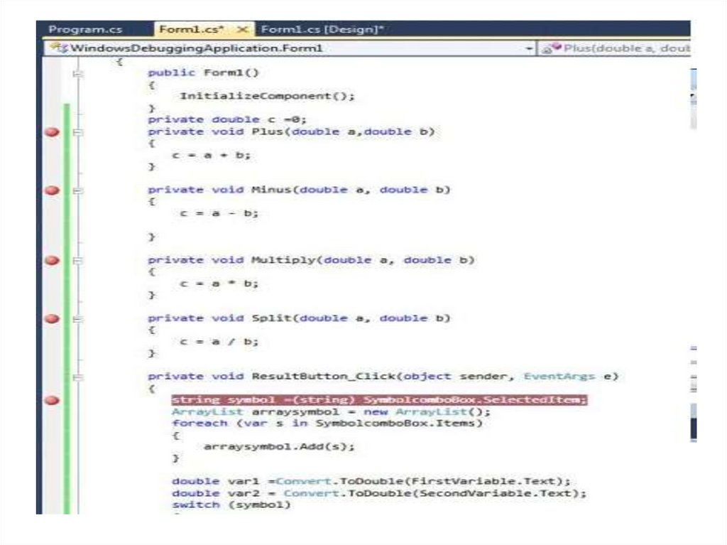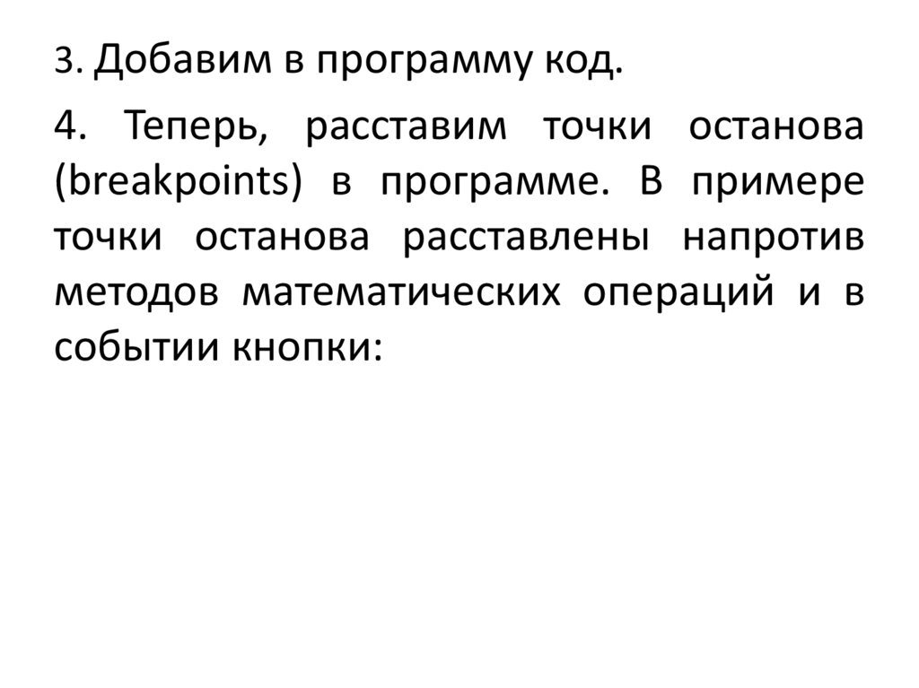 3. Добавим в программу код.4. Теперь, расставим точки останова