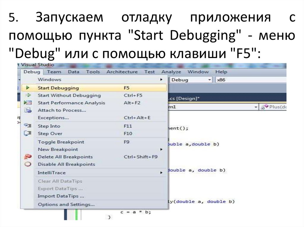 Запускаем отладку приложения спомощью пункта "Start Debugging" - меню