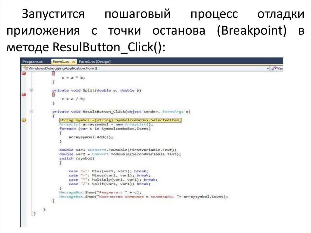 Запустится пошаговый процесс отладкиприложения с точки останова (Breakpoint) в