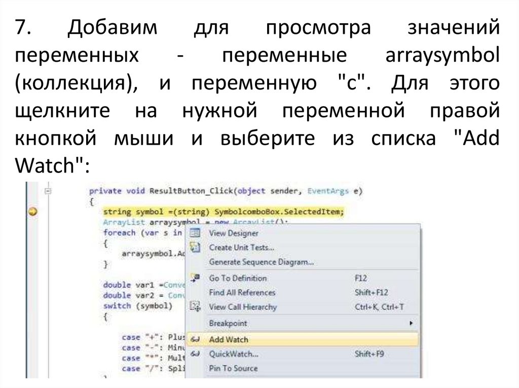 QuickWatch. Если нужно добавить в окно Watch