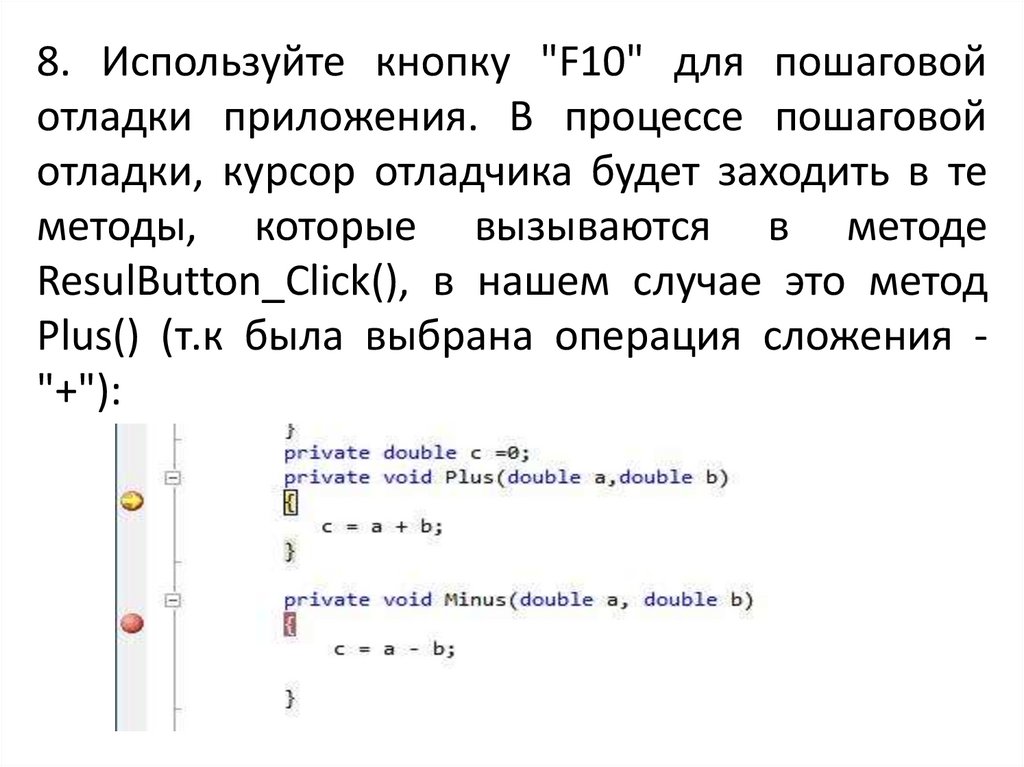 8. Используйте кнопку "F10" для пошаговойотладки приложения. В процессе пошаговой