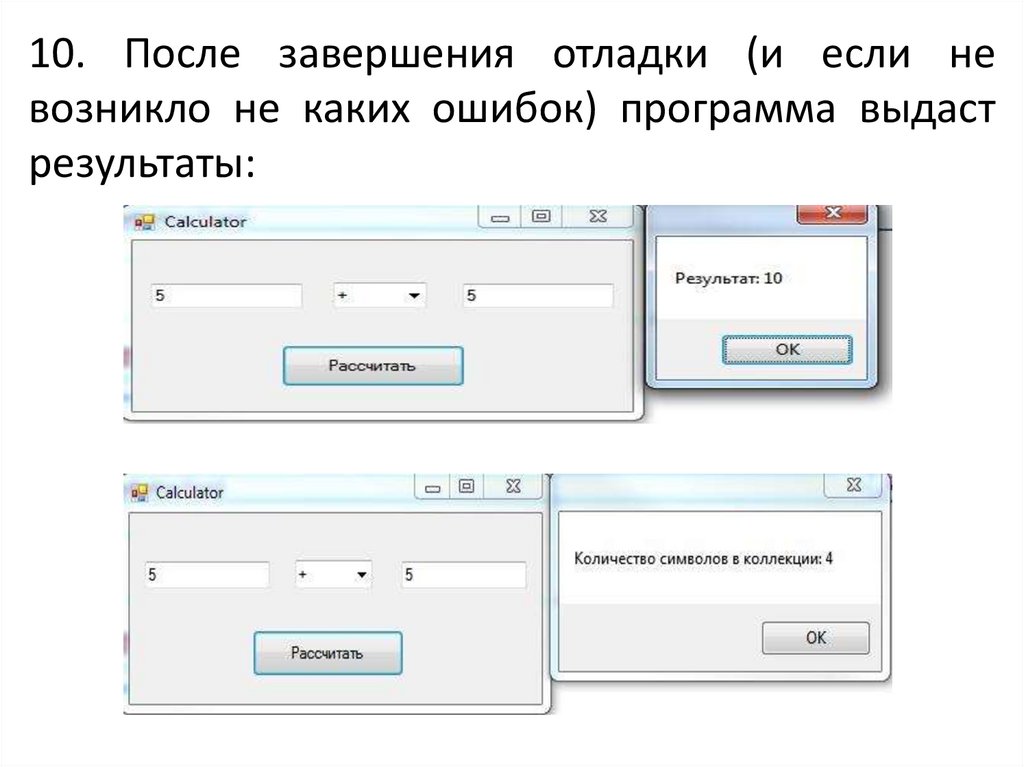 10. После завершения отладки (и если невозникло не каких ошибок) программа выдаст