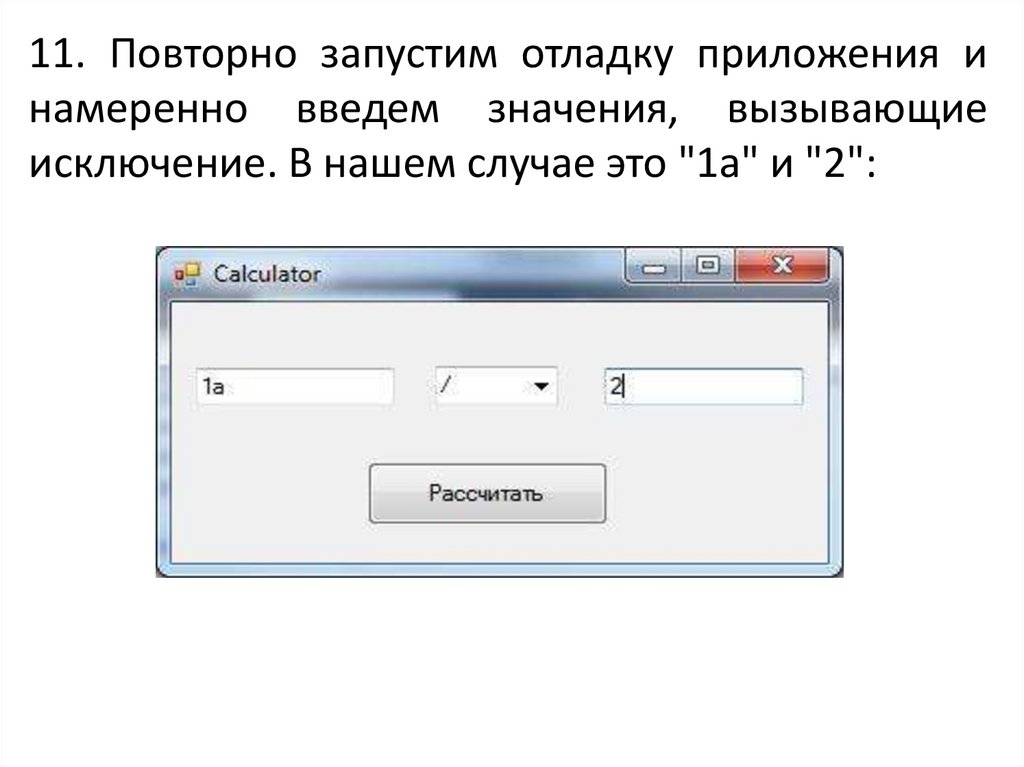 11. Повторно запустим отладку приложения инамеренно введем значения, вызывающие