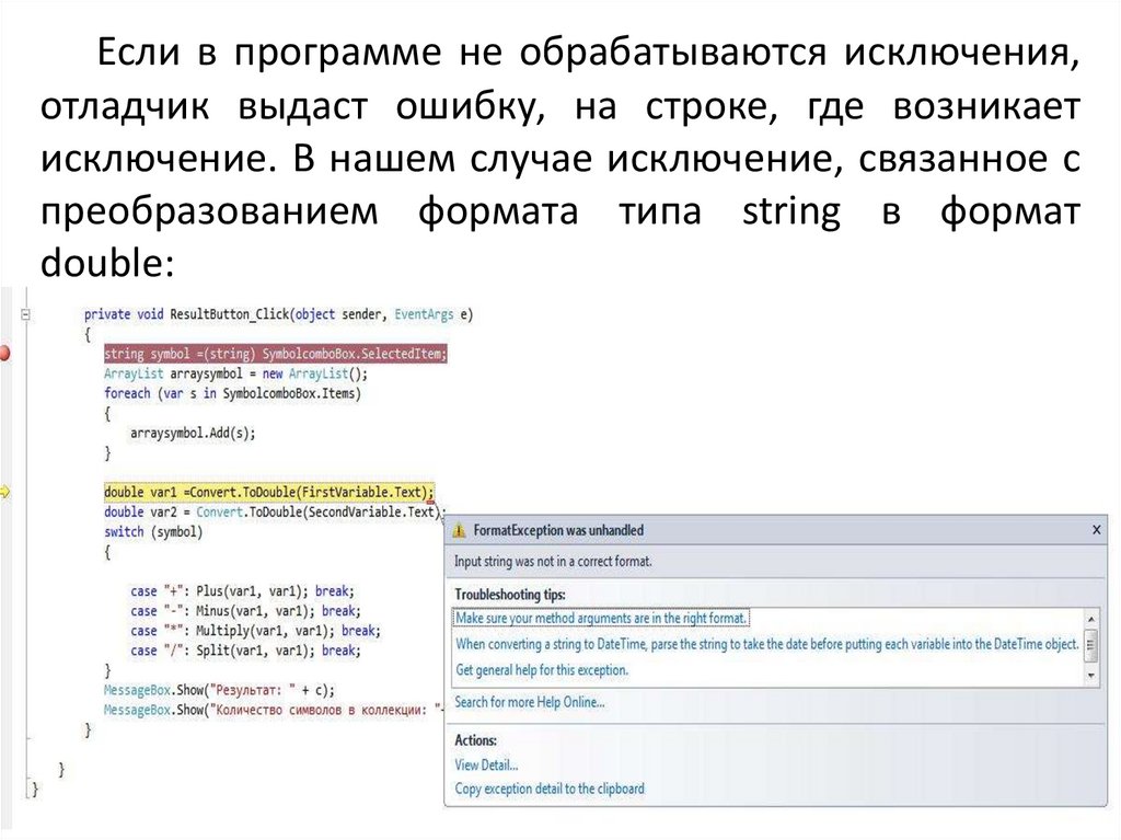 Если в программе не обрабатываются исключения,отладчик выдаст ошибку, на строке, где возникает