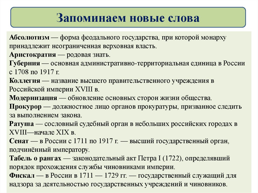 Запоминаем новые словаАбсолютизм — форма феодального государства, при которой монарху