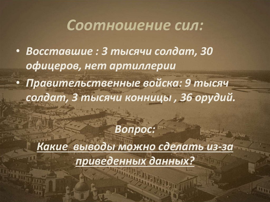 Соотношение сил:• Восставшие : 3 тысячи солдат, 30