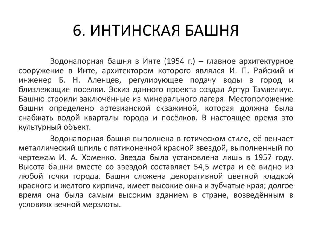 6. ИНТИНСКАЯ БАШНЯВодонапорная башня в Инте (1954 г.) – главное архитектурное