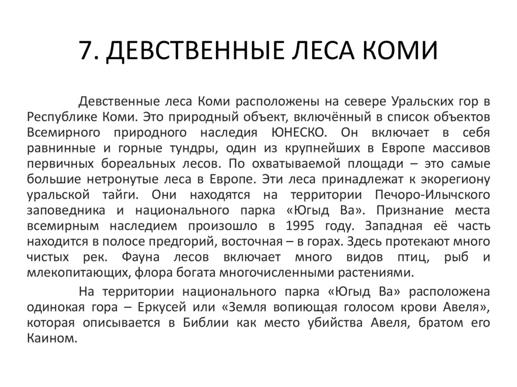 7. ДЕВСТВЕННЫЕ ЛЕСА КОМИДевственные леса Коми расположены на севере Уральских гор в