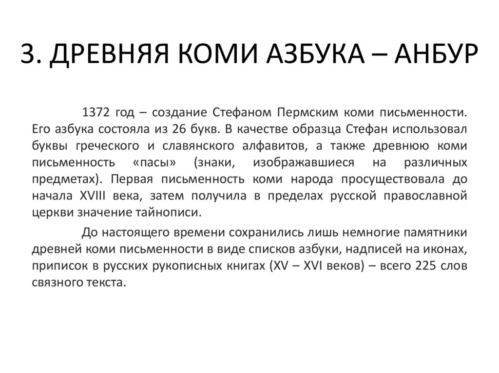 3. ДРЕВНЯЯ КОМИ АЗБУКА – АНБУР1372 год – создание Стефаном Пермским коми письменности.