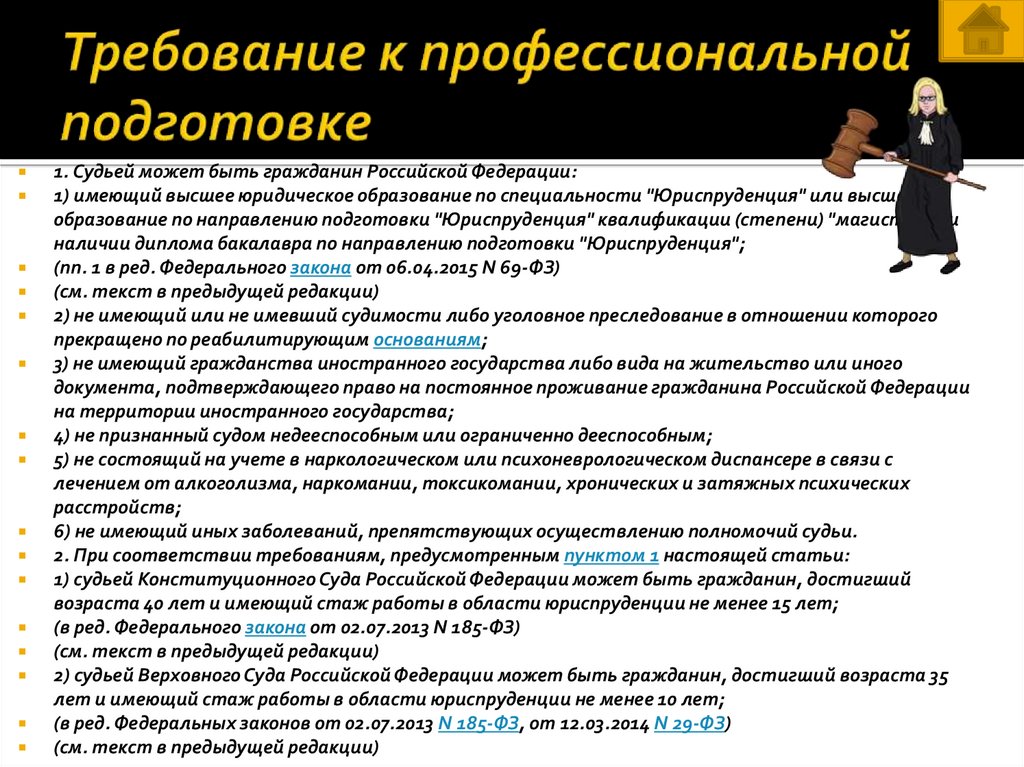 1. Судьей может быть гражданин Российской Федерации:1) имеющий высшее юридическое образование по специальности "Юриспруденция" или высшее