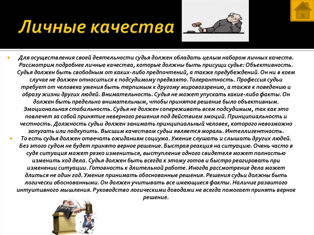 Для осуществления своей деятельности судья должен обладать целым набором личных качеств.Рассмотрим подробнее личные качества, которые должны быть присущи судье: Объективность.