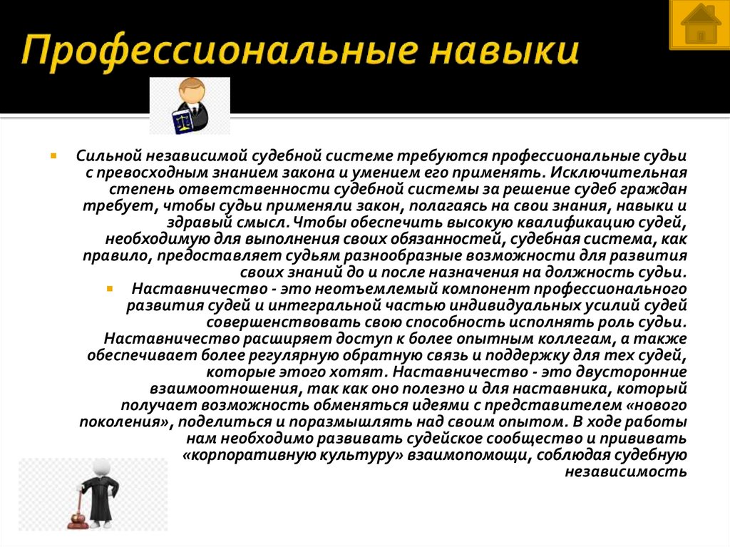 Сильной независимой судебной системе требуются профессиональные судьис превосходным знанием закона и умением его применять. Исключительная