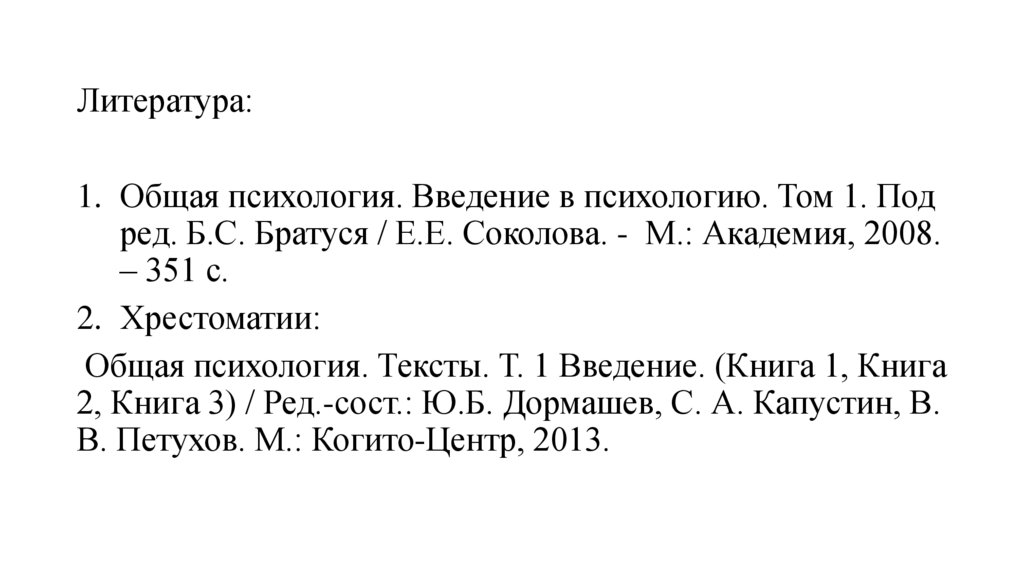 Литература:1. Общая психология. Введение в психологию. Том 1. Под