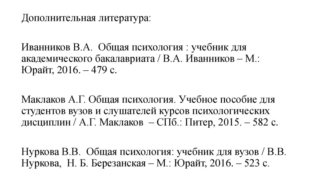 Дополнительная литература:Иванников В.А. Общая психология : учебник для