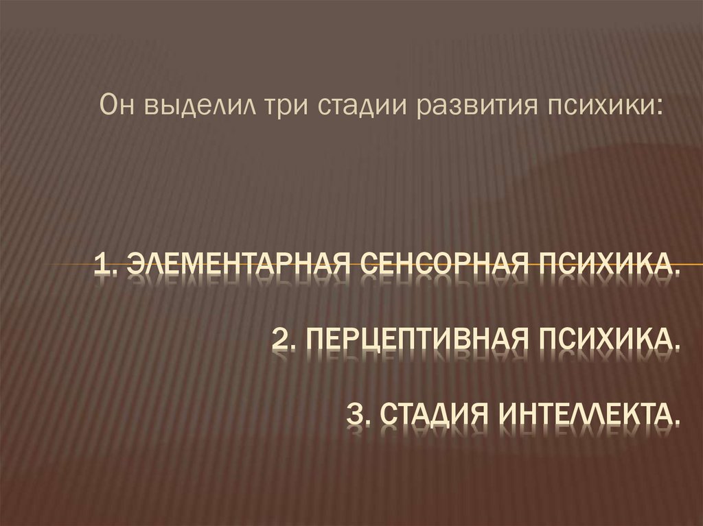 Он выделил три стадии развития психики:1. ЭЛЕМЕНТАРНАЯ СЕНСОРНАЯ ПСИХИКА.