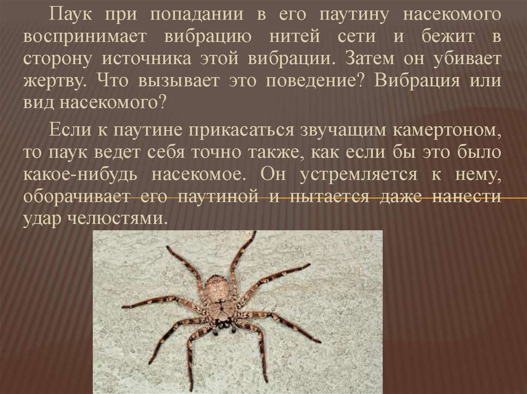 Паук при попадании в его паутину насекомоговоспринимает вибрацию нитей сети и бежит в