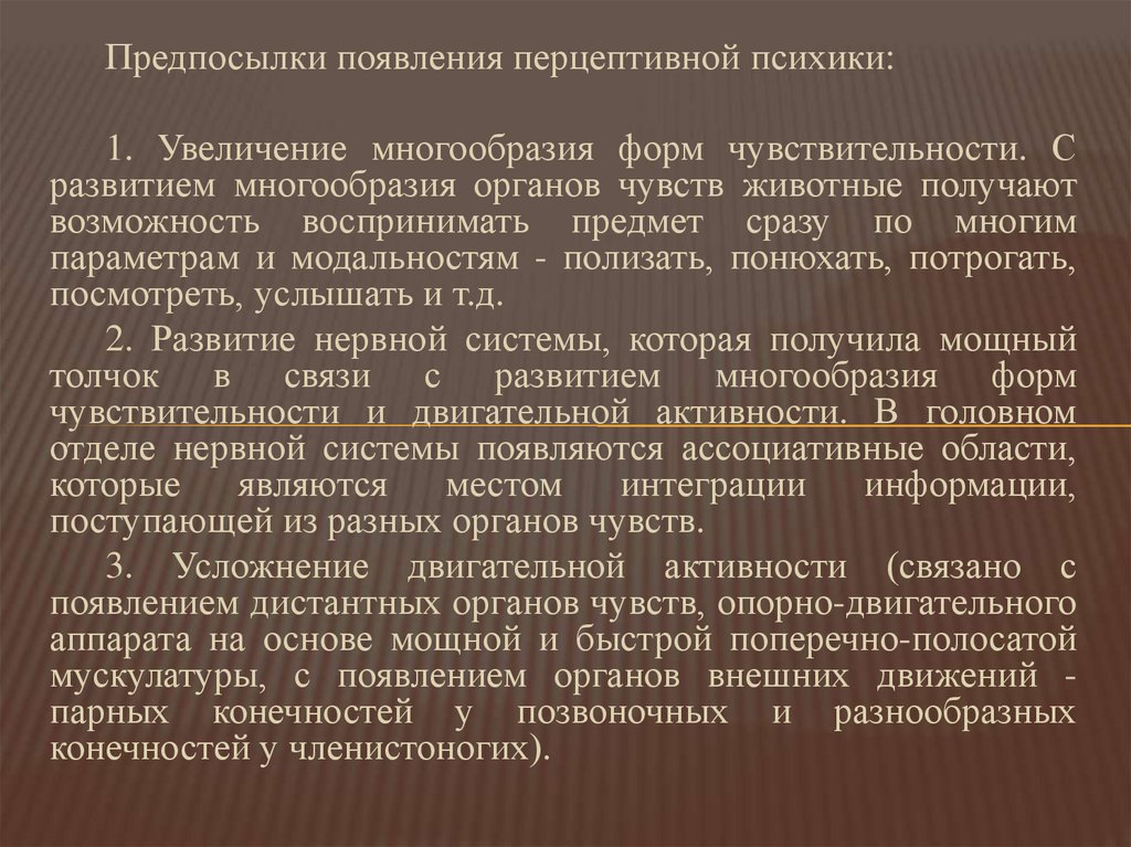 Предпосылки появления перцептивной психики:1. Увеличение многообразия форм чувствительности. С