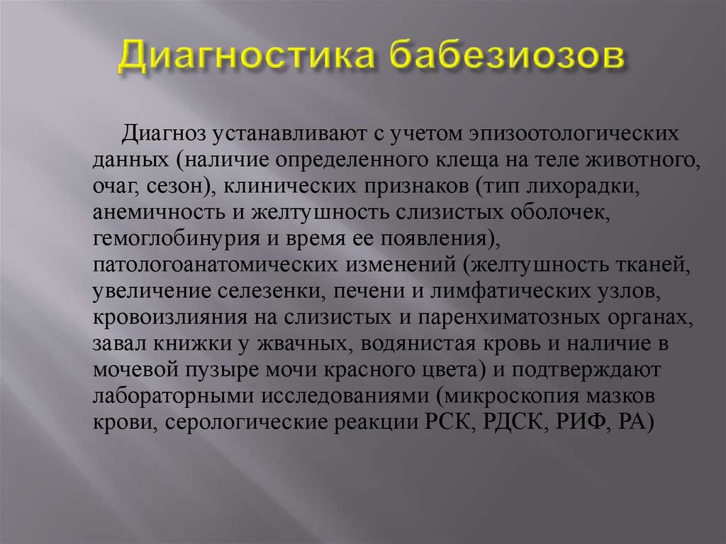 Диагноз устанавливают с учетом эпизоотологическихданных (наличие определенного клеща на теле животного,