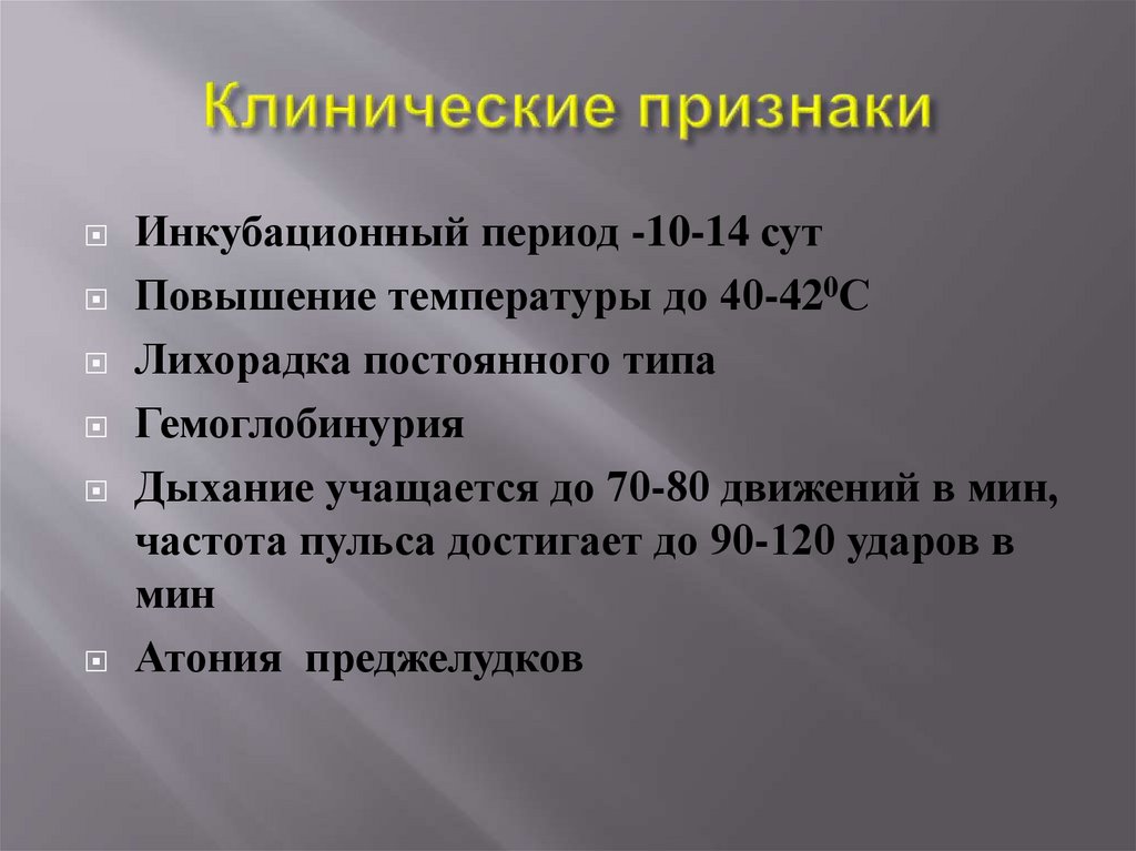 Инкубационный период -10-14 сутПовышение температуры до 40-420С