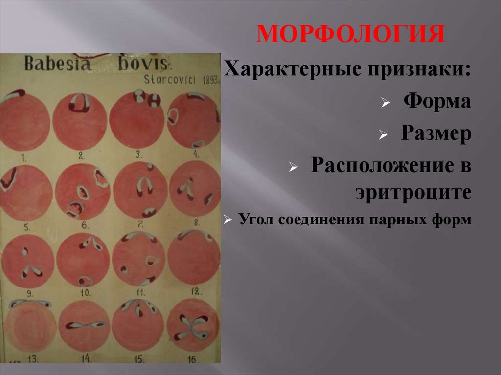 Babesia круглой, кольцевидной формы, размер паразитаменьше радиуса эритроцита, располагается на периферии,
