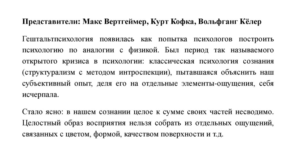 Представители: Макс Вертгеймер, Курт Кофка, Вольфганг КёлерГештальтпсихология появилась как попытка психологов построить