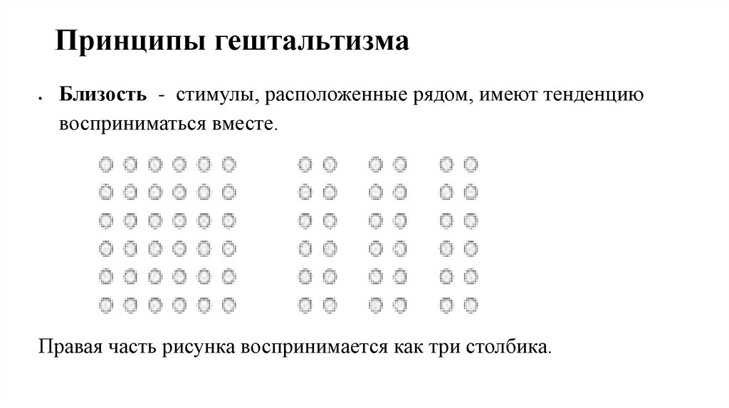 Принципы гештальтизмаБлизость - стимулы, расположенные рядом, имеют тенденцию