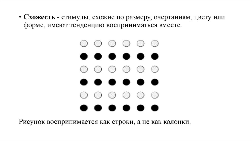 • Схожесть - стимулы, схожие по размеру, очертаниям, цвету илиформе, имеют тенденцию восприниматься вместе.