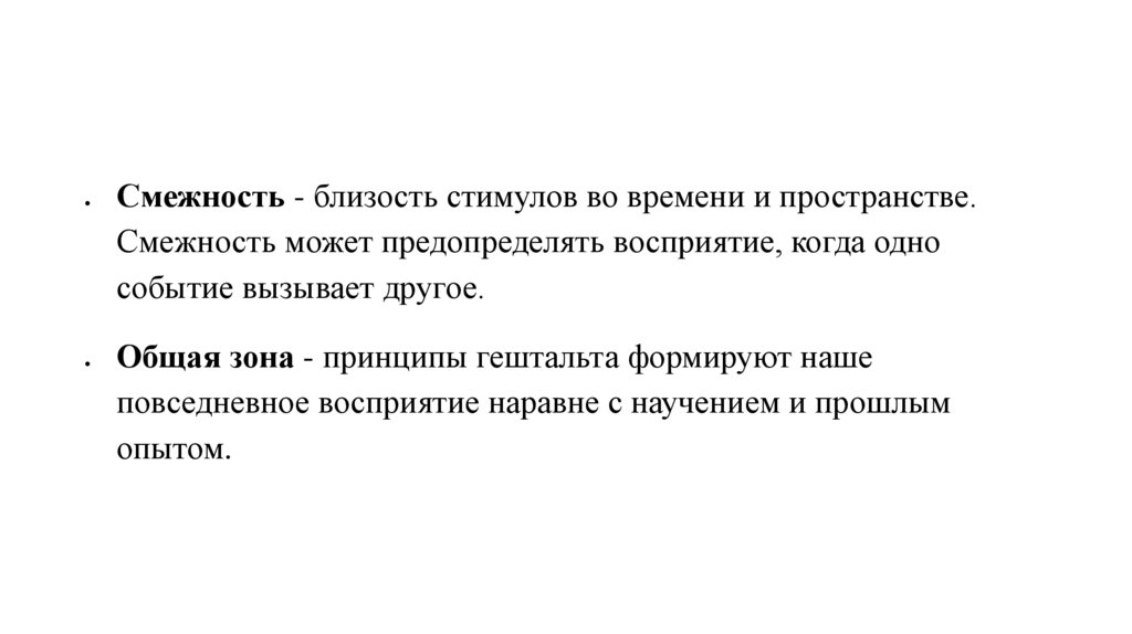 Смежность - близость стимулов во времени и пространстве.Смежность может предопределять восприятие, когда одно