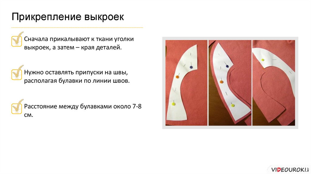 Прикрепление выкроекСначала прикалывают к ткани уголки