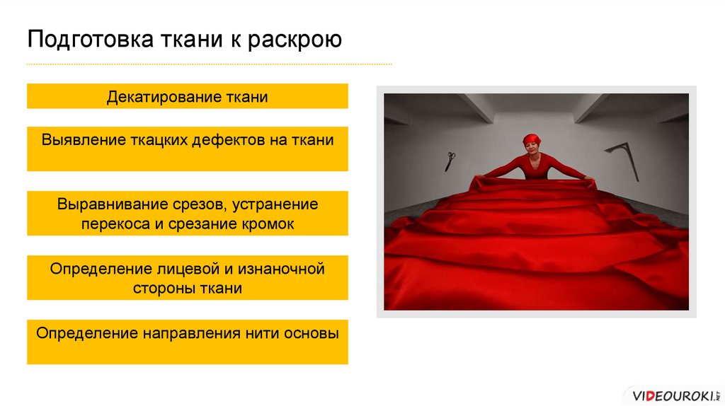 Подготовка ткани к раскрою (записать в тетрадь)• Декатирование ткани - это влажно-тепловая обработка ткани перед