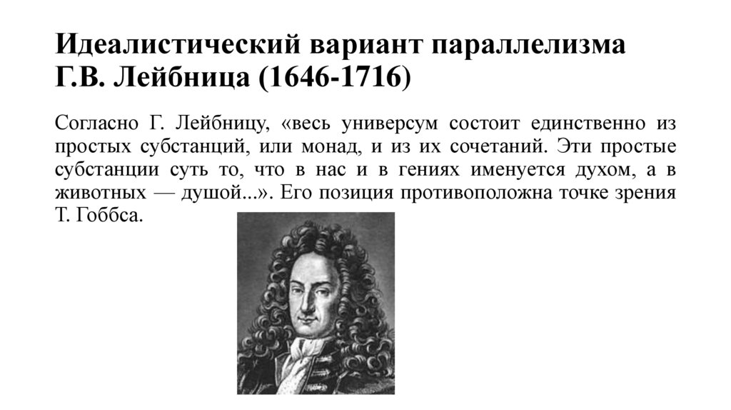 Идеалистический вариант параллелизмаГ.В. Лейбница (1646-1716)