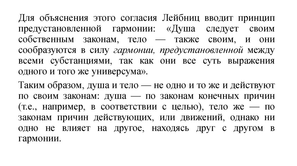 Для объяснения этого согласия Лейбниц вводит принциппредустановленной гармонии: «Душа следует своим