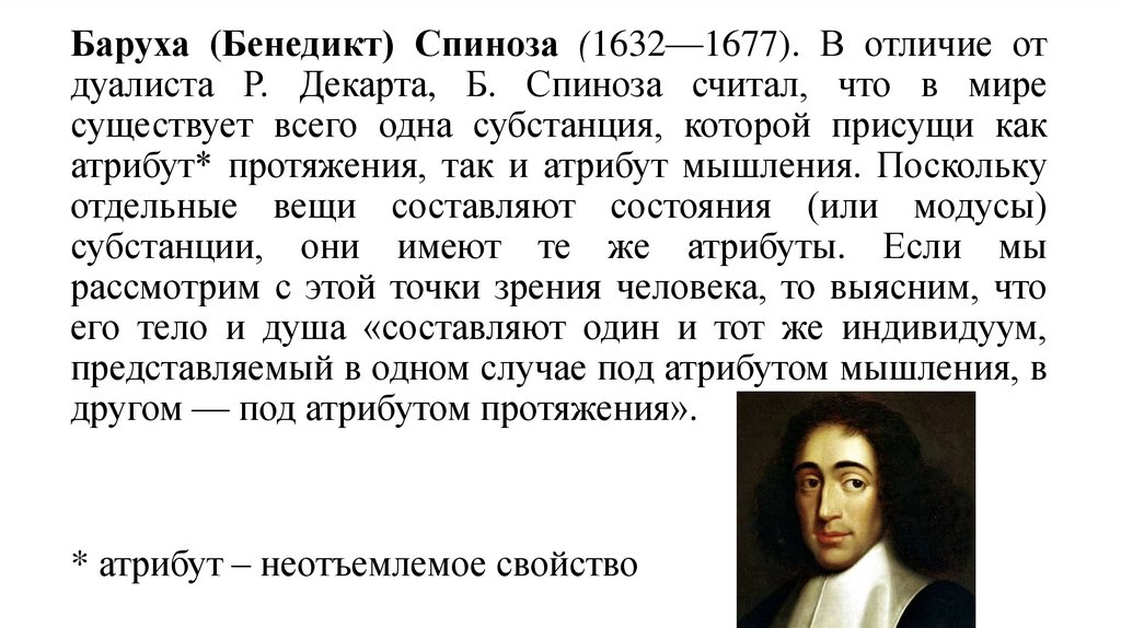 Баруха (Бенедикт) Спиноза (1632—1677). В отличие отдуалиста Р. Декарта, Б. Спиноза считал, что в мире