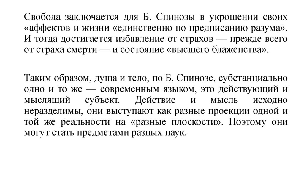 Свобода заключается для Б. Спинозы в укрощении своих«аффектов и жизни «единственно по предписанию разума».