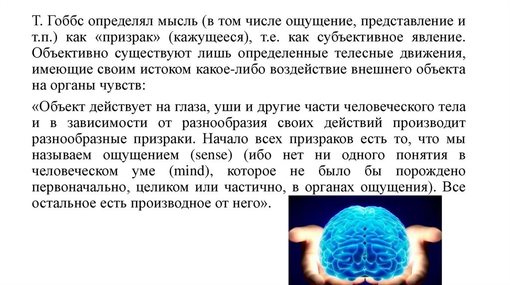 Т. Гоббс определял мысль (в том числе ощущение, представление ит.п.) как «призрак» (кажущееся), т.е. как субъективное явление.